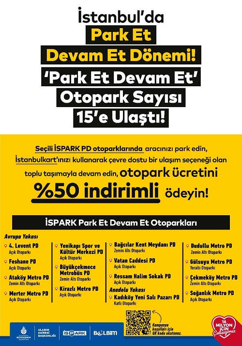 İstanbullular, Kadıköy Yenikapı Salı Pazarı Katlı Otoparkı, Ressam Halim Sokak Açık Otoparkı, Vatan Caddesi Açık Otoparkı, Gülsuyu Metro Zemin Altı Otoparkı, Ataköy Metro Durağı Yanı Zemin Altı Otoparkını da “Park Et Devam Et” uygulaması kapsamında kullanabilecekler.