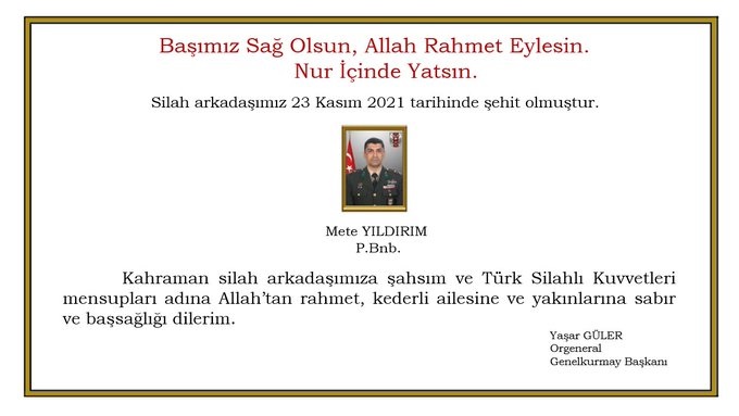 Savunma Bakanlığından yapılan yazılı açıklamada, "Barış Pınarı Harekat Bölgesinde, 23 Kasım 2021 tarihinde, kahraman silah arkadaşımız Piyade Binbaşı Mete Yıldırım meydana gelen silah kazası sonucu yaralanmış, derhal hastaneye sevk edilmiş, yapılan tüm müdahalelere rağmen kurtarılamayarak şehit olmuştur. Bizleri derin bir acı ve üzüntüye boğan bu olayda hayatını kaybeden aziz şehidimize Allah’tan rahmet, kederli ailesine, Türk Silahlı Kuvvetleri ile asil milletimize başsağlığı ve sabır dileriz" denildi.
