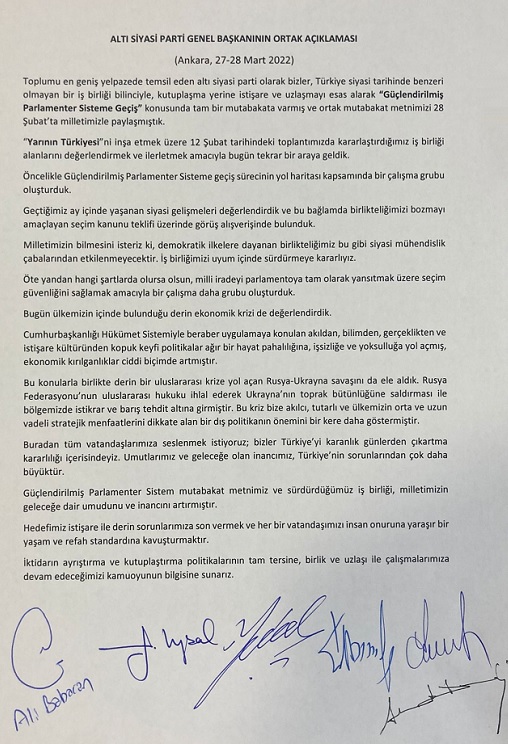CHP Genel Başkanı Kılıçdaroğlu, DEVA Partisi Genel Başkanı Babacan, DP Genel Başkanı Uysal, Gelecek Partisi Genel Başkanı Davutoğlu, İYİ Parti Genel Başkanı Akşener ve SP Genel Başkanı Karamollaoğlu, Altı Siyasi Parti Genel Başkanının Ortak Açıklaması (Ankara, 27-28 Mart 2022)...