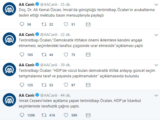 AA'dan İmralı'dan HDP'ye İstanbul seçimi için tarafsızlık çağrısı yaptığını iddia etti. AA Twitter hesabından görüşmeyi 4 satır ile duyurdu.