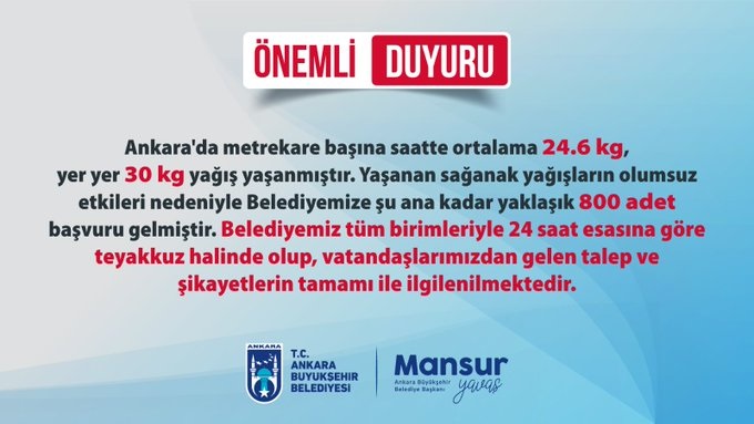 Ankara Büyükşehir'den yapılan duyuruda; "Ankara'da metrekare başına ortalama 24,6 kg, yer yer 30 kg yağış yaşanmıştır. Yaşanan sağnak yağışların olumsuz etkileri nedeniyle Belediyemize şu ana kadar yaklaşık 800 adet başvuru gelmiştir. Belediyemiz tüm birimleriyle 24 saat esasına göre teyakuz halinde olup, vatandaşlarımızdan gelen talep ve şikayetlerin tamamı ile ilgilenilmektedir. Ankara Büyükşehir Belediyesi ekiplerimiz, sağanak yağışın olumsuz etkilerini gidermek için çalışmalarını aralıksız sürdürüyor. ABB ekiplerimiz, şiddetli yağış nedeniyle oluşabilecek su baskınlarına karşı önlemler alarak çalışmalarını sürdürüyor" denildi.