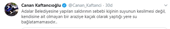 CHP İstanbul İstanbul İl Başkanı Canan Kaftancıoğlu sosyal medya hesabından saldırının gerekçesiyle ilgili açıklamada bulundu. Kaftancıoğlu Adalar Belediyesi'ne yapılan saldırının sebebiyle ilgili olarak kişinin "kendisine ait olmayan bir araziye kaçak olarak yaptığı yere su bağlatamadığından" gerçekleştirdiğini belirtti.