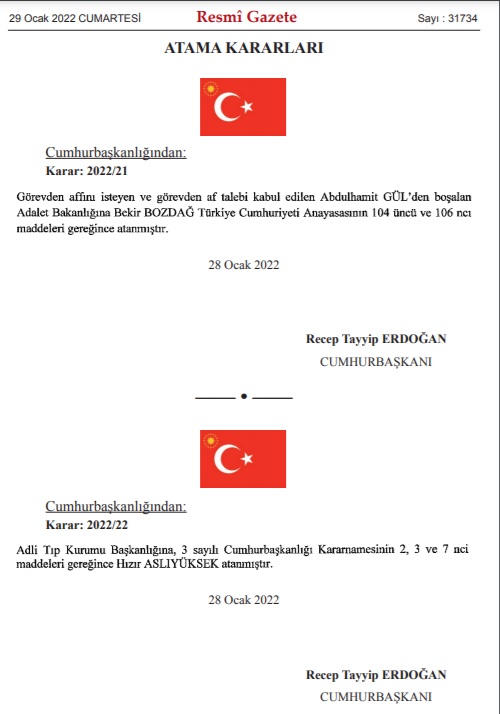 Resmi Gazetede Adalet Bakanı Abdülhamit Gül'ün görevden af talep ettiği ve kabul edildiği yerine de eski bakan Bekir Bozdağ'ın getirildiği kararname yayımlandı.