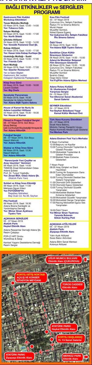 Ünlü sanatçıların yer alacağı açılış ve kapanış konserleri, Hintli dansçılar ve Alya Dormen gösterisi, Kostümlü Gösteri Grupları Korteji, Motorize Ekipler ve bandolardan oluşan karnaval korteji, Su korteji, Türkiye'nin her yerinden 300 pilot ile gelecek olan Türk Choppers MK Merkezpark'taki Motosiklet Senfonisi, Türk Riders, VosFest ve Klasik Otomobil Kulübü gösterisi, sokak konserleri, yurt içi ve yurt dışından çeşitli sanatsal sergiler, açık hava dans ve spor gösterileri, söyleşiler ve tiyatro aktiviteleri, Adana Kültürünü anlatan performanslar ve sanatsal gösteriler sergilenecek.