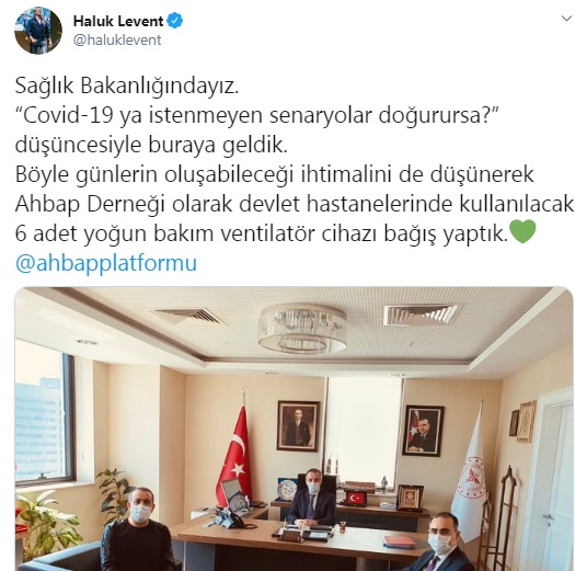 Sağlık Bakanlığı'nı ziyaret eden AHBAP Derneği'nin kurucusu Haluk Levent sosyal medya hesabından devlet hastanelerinde kullanılacak 6 adet yoğun bakım ventilatör cihazı bağış yaptıklarını paylaştı. Levent yapılan bağışı "Sağlık Bakanlığındayız. “Covid-19 ya istenmeyen senaryolar doğurursa?” düşüncesiyle buraya geldik. Böyle günlerin oluşabileceği ihtimalini de düşünerek Ahbap Derneği olarak devlet hastanelerinde kullanılacak 6 adet yoğun bakım ventilatör cihazı bağış yaptık" ifadeleriyle duyurdu.