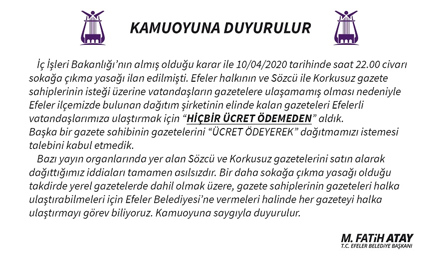 Bazı yayın organlarında yer alan Sözcü ve Korkusuz gazetelerini satın alarak dağttığımız iddiaları tamamen asılsızdır. Bir daha sokağa çıkma yasağı olduğu taktirde yerel gazetelerde dahil olmak üzere, gazete sahiplerinin gazeteleri halka ulaştırabilmeleri için Efeler Belediye'ine vermeleri halinde here gazeteyi halka ulaştırmayı görev biliyoruz