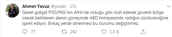 Barış Pınarı Harekatı'na dair Twitter'dan değerlendirmede bulunan emekli Tümgeneral Ahmet Yavuz PYD/PKK'nın geri çekileceğinı ifade ederek "Genel gidişat PYD/PKK’nın Afrin’de olduğu gibi ricat ederek güvenli bölge olarak belirlenen alanın güneyinde ABD himayesinde varlığını sürdüreceğine işaret ediyor. Birkaç yerde direnmesi bu durumu değiştirmez" yorumunda bulundu.
