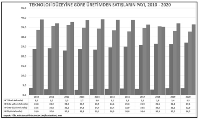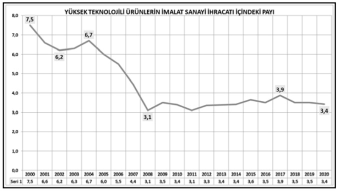 Dikkat edilirse 2000’li yıllarda Türkiye imalat sanayiinde bir dönüşüm yapamadığı için teknoloji yoğun ürün üretim ve ihracatında ileri gidememiş, adeta yerinde saymıştır. Düşük, orta-düşük ve orta-yüksek teknolojili ürünlerin dağılımında da önemli sayılabilecek bir değişiklik olmamıştır. Türkiye ekonomisi 1970’lerde ağırlıklı olarak tarımsal ürünlere dayalı iken; 24 Ocak 1980 kararları sonrasında emek yoğun teknolojilerin hâkim olduğu sektörlere ve 1990’lı yıllarda da orta-düşük ve orta-yüksek teknolojili sektörlere geçtiği halde 2000’li yıllarda yüksek teknolojili sektörlere geçememiştir.