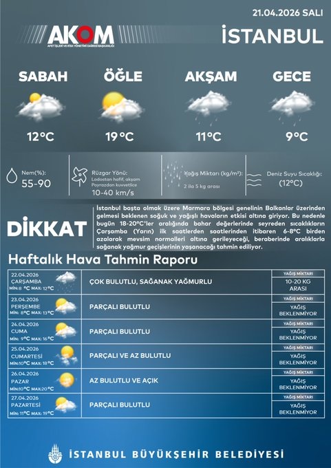 Afet Koordinasyon Merkezi (AKOM) tarafından yayımlanan hava tahmin raporuna göre İstanbul’da gün boyunca parçalı bulutlu ve yer yer yağışlı hava etkili olacak. Akşam saatlerinde yağmur geçişleriyle birlikte sıcaklıklar düşecek.