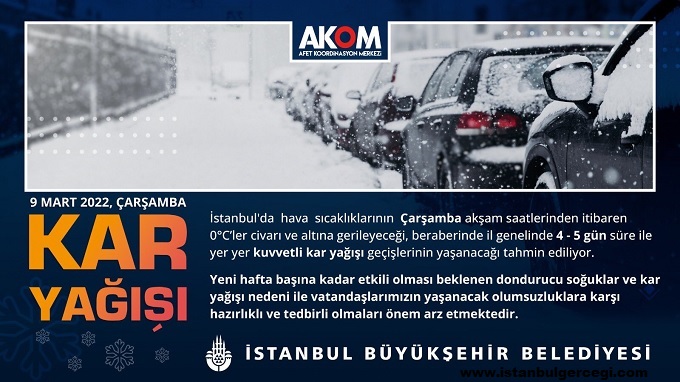 AKOM verisine göre Çarşamba akşamdan itibaren İstanbul, Sibirya soğuk hava dalgasının etkisi altına girecek. Hafta başına kadar etkili olması beklenen dondurucu soğuklar ve kar yağışına karşı ekiplerimiz teyakkuzda olacak. Vatandaşlarımızı dikkatli olmaları noktasında uyarırız." denildi.