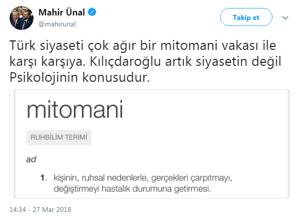 Ünal, sosyal medya hesabı Twitter üzerinden yaptığı açıklamada "Türk siyaseti çok ağır bir mitomani vakası ile karşı karşıya. Kılıçdaroğlu artık siyasetin değil Psikolojinin konusudur" dedi.