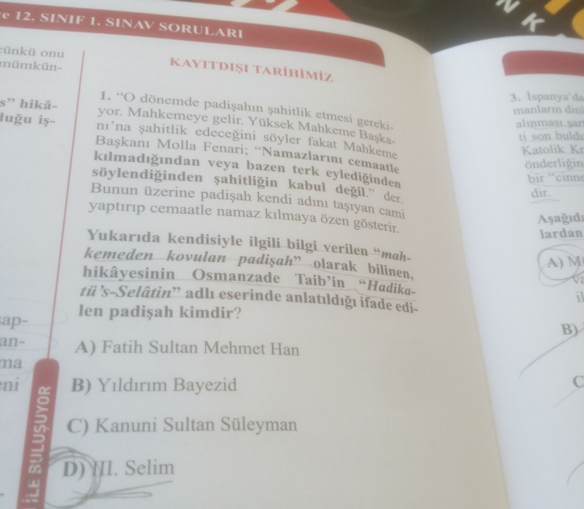 Yarışmanın "Kayıt dışı tarihimiz" bölümündeyse, hangi Osmanlı padişahının namazları cemaatle kılmadığı için şahitliğinin kabul edilmediği sorusu yöneltildi.