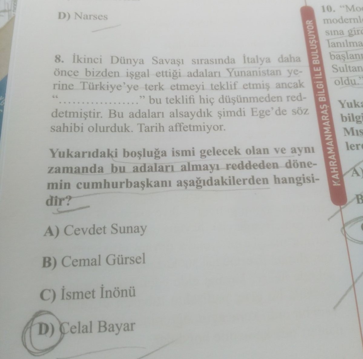 Bir başka soruda da 2. Dünya Savaşı sırasında Ege adalarının Yunanistan'a terk edildiği iddia edilerek, bu adaları reddeden dönemin cumurbaşkanının kim olduğu soruldu. Seçenekler arasında 2. Dünya Savaşı sırasında cumhurbaşkanlığı yapan İsmet İnönü de bulunuyor.