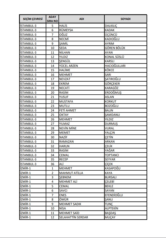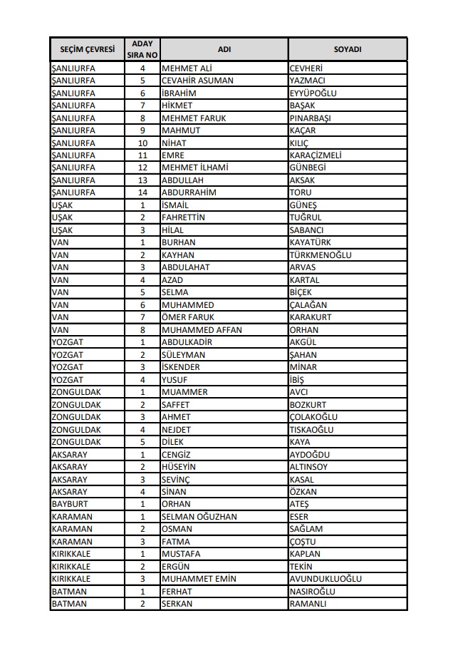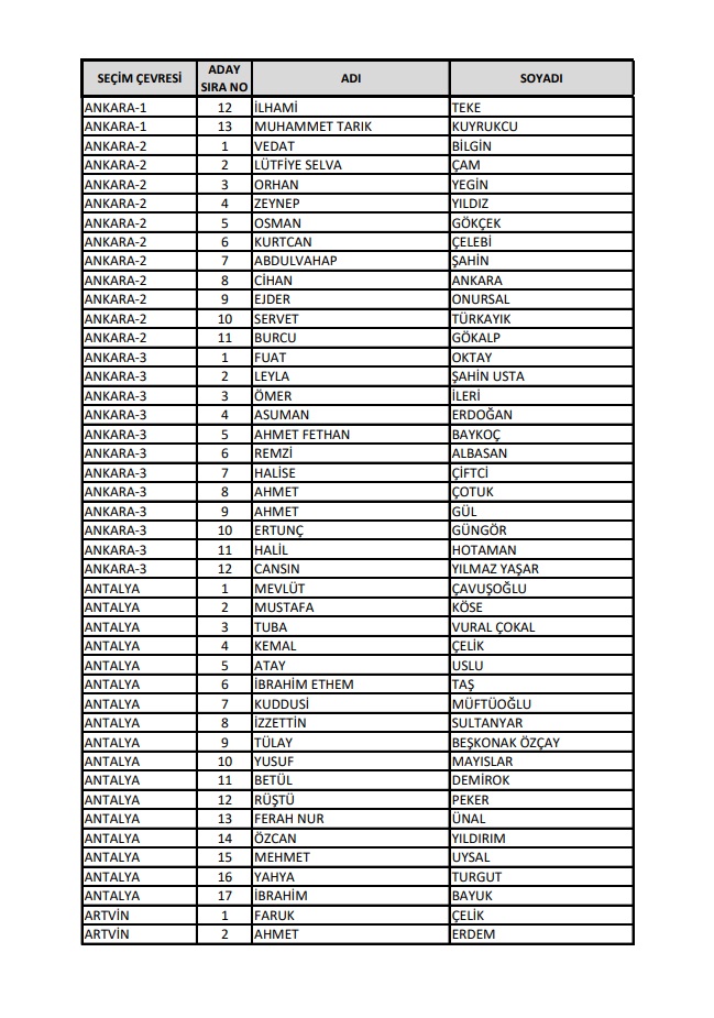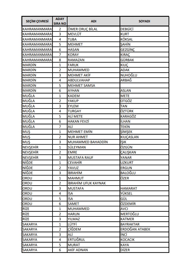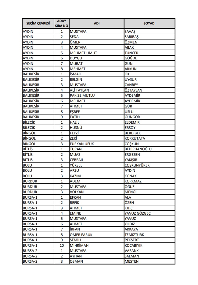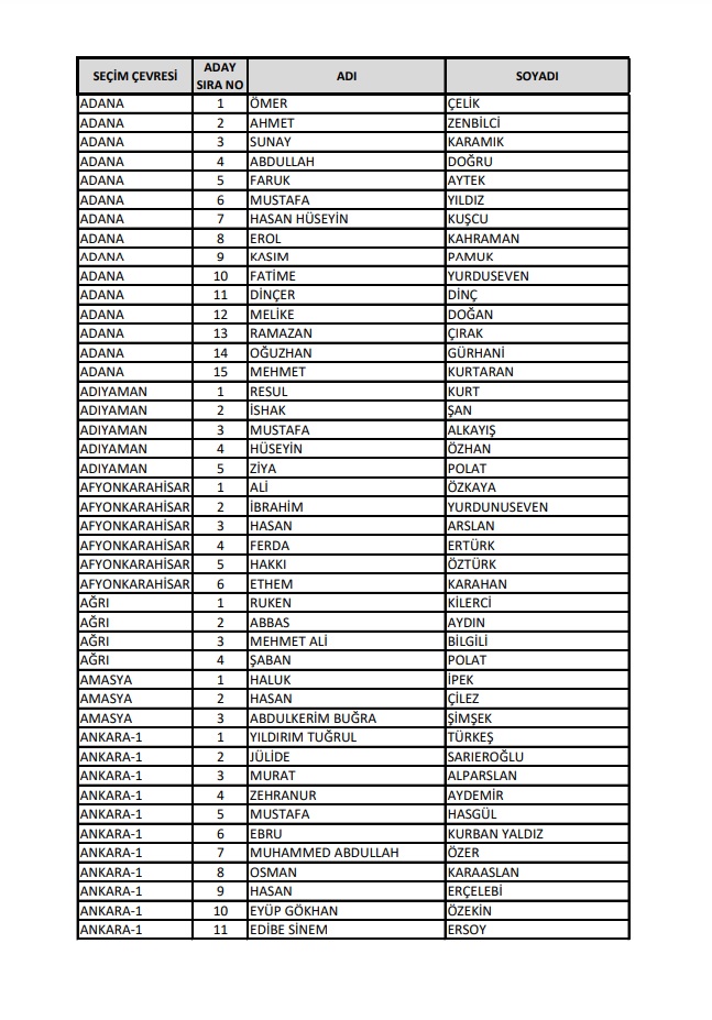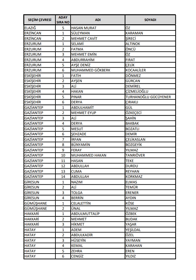 AKP'nin 28. Dönem Milletvekilleri Aday Listesi yayımlandı.