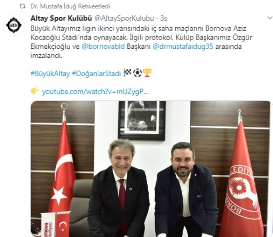 Bornova Belediye Başkanı Mustafa İduğ protokolun imzalandığını "Büyük Altayımız ligin ikinci yarısındaki iç saha maçlarını Bornova Aziz Kocaoğlu Stadı’nda oynayacak. İlgili protokol, Kulüp Başkanımız Özgür Ekmekçioğlu ve @bornovabld Başkanı @drmustafaidug35 arasında imzalandı" ifadeleriyle duyurdu.