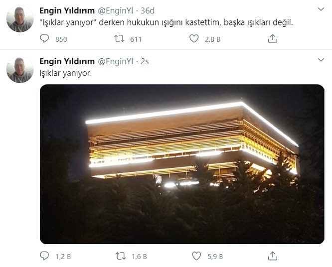 Engin yıldırım tekrar tweet attı: "Işıklar yanıyor" derken hukukun ışığını kastettim, başka ışıkları değil.