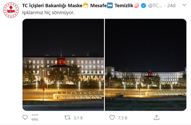 Anayasa Mahkemesi Başkan vekili Engin Yıldırım sosyal medya hesabından Işıklar Yanıyor diye tweet attı. Cevap İçişleri Bakanlığı'nın resmi twitter hesabından geldi 'Işıklarımız hiç sönmüyor'