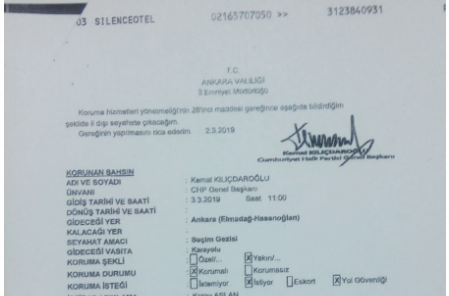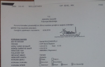 "Şehit Piyade Sözleşmeli Er Yener Kırıkçı’nın 21.04.2019 günü Çubuk ilçesi Akkuzulu köyündeki cenaze töreni ile ilgili olarak, CHP Genel Başkanı Sayın Kemal Kılıçdaroğlu’nun yakın koruma personeli tarafından 20.04.2019 günü saat 22.11’de ve 21.04.2019 günü saat 10.03’te Koruma Şube Müdürlüğümüz Nöbetçi Amirliği Hizmetlerinde kullanılan 0505 318 06 32 nolu telefon aranarak cenaze yeri, saati ve cenaze yakınlarının irtibat bilgileri istenilmiş, katılım durumu bildirilmediği gibi sorulduğunda ise henüz programın belli olmadığı söylenmiştir.