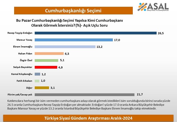 ASAL Araştırma ve Danışmanlık Şirketinin Aralık ayında 1860 kişi ile yaptığı son ankette, Bu pazar Cumhurbaşkanlığı seçimi yapılsa kimi Cumhurbaşkanı olarak görmek istersiniz? diye ucu açık bir soru soruldu.