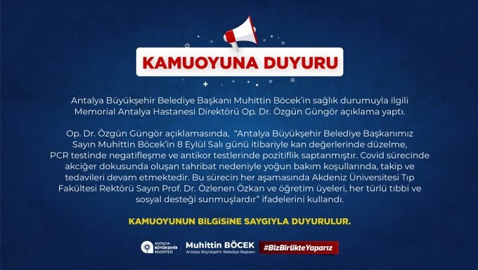 Sosyal medyada asılsız ve çirkin haberler dolaşmaktadır. Antalya Büyükşehir Belediye Başkanımız Sayın Muhittin Böcek’in durumu yoğun bakıma alındıktan sonra daha iyiye gitmekte olup tedavisine devam edilmektedir. En yakın zamanda bizlerle olacaktır" denildi.