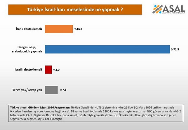 ASAL Araştırma ve Danışmanlık Şirketi yeni anketinde Türkiye, İsrail-İran meselesinde ne yapmalı? diye soruldu.