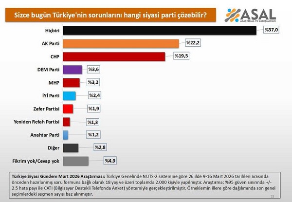 SONDAKİKA; ASAL Araştırma ve Danışmanlık Şirketinin 2026 Mart ayında 2000 kişi ile yaptığı son ankette, Türkiye’nin sorunlarını hangi siyasi parti çözebilir? sorusuna yanıt aradı.