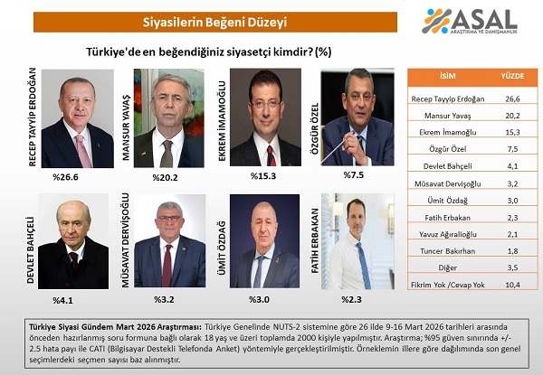 ASAL Araştırma ve Danışmanlık Şirketinin Mart ayında 2000 kişi ile yaptığı son ankette, Türkiye'de en beğendiğiniz siyasetçi kimdir? diye soruldu.