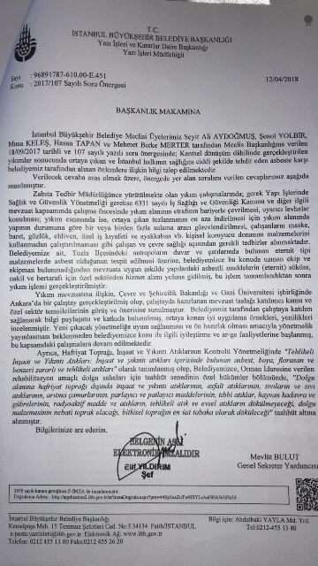 CHP İBB Meclis Üyesi M. Berke Merter 10 ay önce 18.09.2017 tarihinde hazırladığı ve yerinde inceleme yaparak fotoğrafladığı, “İstanbul halkının sağlığını tehdit eden Asbest, alınması gereken önlemler hakkında” konulu yazılı soru önergesinde “Kentsel dönüşüm sürecinin yaşandığı ve milyonlarca insanın yaşadığı İstanbul’da insan sağlığını önemli oranda tehdit eden ve kanserojen etkisi bulunan ve Kentsel dönüşüm sırasında yaşanan yıkımlar dolayısıyla meydana gelecek asbest tehlikesine karşı İBB’nin bir önlemi ve hazırlığı olup olmadığı” sorusunu sordu.