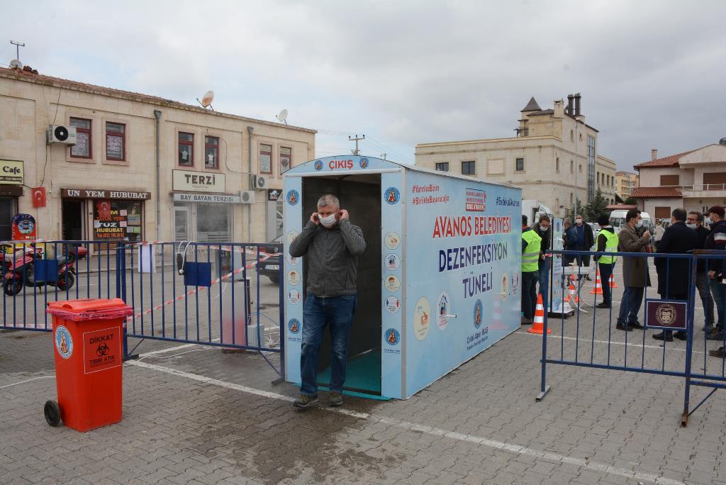 Avanos Belediye Başkanı Celal Alper İbaş, "Avanos Belediyesi Park ve Bahçeler Müdürlüğü ekipleri tarafından yapılan dezenfeksiyon tünelimiz hizmete girdi. Avanos Belediyesi Korona virüs ile mücadele kapsamında, Park ve Bahçeler Müdürlüğü ekipleri tarafından belediye iş ocaklarında yapılan dezenfeksiyon tüneli İlçe pazarına girmek isteyen vatandaşların hizmetine sunuldu. Vatandaşlarımız, sosyal mesafe kuralları çerçevesinde dezenfeksiyon tüneline girmek için sıraya girerken geçiş yapmadan önce el dezenfeksiyonu yapılıp daha sonra maske alıp pazara giriş yapıyor. Dezenfeksiyon tünelinden geçiş yapmayan vatandaşlar ilçe pazarına giremiyor" dedi.