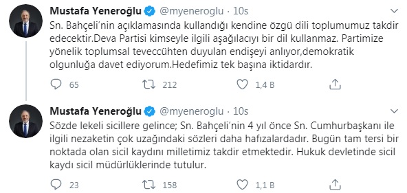 Deva Partisi Milletvekili Mustafa Yeneroğlu sosyal medya hesabından Bahçeli'nin o sözlerine yanıt verdi. "Sözde lekeli sicillere gelince; Sn. Bahçeli’nin 4 yıl önce Sn. Cumhurbaşkanı ile ilgili nezaketin çok uzağındaki sözleri daha hafızalardadır" diyen Yeneroğlu şu ifadeleri paylaştı: