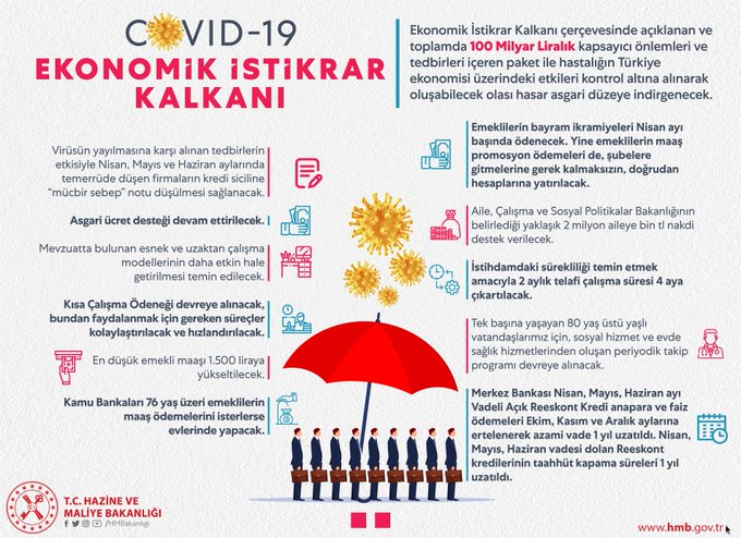 Hazine ve Maliye Bakanı Berat Albayrak sosyal medya hesabı üzerinden yaptığı açıklamada; Ekonomik İstikrar Kalkanı Paketi ile istihdamı korumak, reel sektörümüzü ve esnafımızı desteklemek için gerekli adımları devreye alıyoruz.