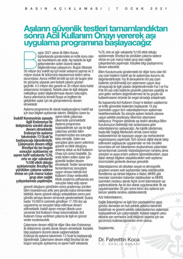 Sağlık Bakanı Dr. Fahrettin Koca 2021 yılının ilk Bilim Kurulu Toplantısında Aşı planlamasını değerlendirdiklerini ve Aşıların güvenlik testleri tamamlandıktan sonra Acil Kullanım Onayı verileceğini duyurdu.