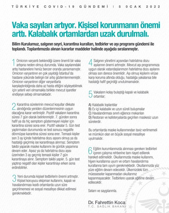"Bilim Kurulumuz, salgının seyri, karantina kuralları, tedbirler ve aşı programı gündemi ile toplandı. Toplantımızda alınan kararlar maddeler halinde aşağıda sıralanmıştır.