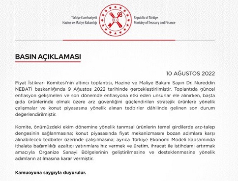 Fiyat İstikrarı Komitesi'nin altıncı toplantısına ilişkin basın açıklaması (10.08.2022)
