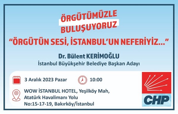 Cumhuriyet Halk Partili Bakırköy Belediye Başkanı Dr. Bülent Kerimoğlu, İstanbul Büyükşehir Belediye Başkan Aday Adaylığı açıklamasını 3 Aralık 2023, Pazar günü Saat:10,00'da Wow Hotel'de yapacak.