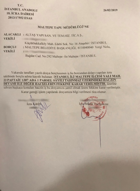 Maltepe Belediyesi ile ALTAŞ Yapı San. ve Tem. Hiz. Tic. A.Ş. arasında, 2013 yılına dayanan borcun ödenmesine rağmen, dosyasının kapatılmamasından dolayı icra dairesi tarafından sehven gerçekleştirilen bir işlemin, kamuoyunda maksatlı bir şekilde çarpıtıldığı ortaya çıktı. İstanbul Anadolu 18. İcra Dairesi tarafından Maltepe Tapu Müdürlüğü’ne verilen dilekçede, “Borçlu tarafın iş bu borcundan dolayı, hacizlerin fekkine (kaldırılmasına) karar verilmiştir. Üzerine sehven konulan haczin iş bu dosyamıza şamil olmak üzere fekkine karar verilmiştir” denildi.