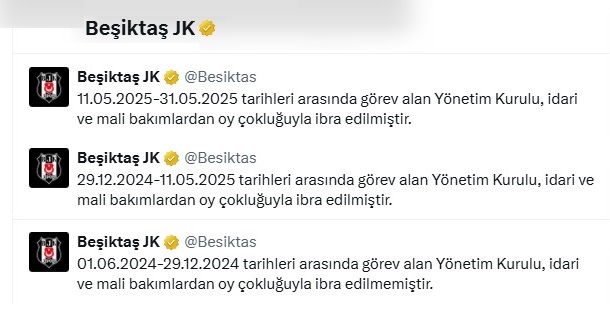Sinan Erdem Spor Salonu'nda gerçekleştirilen Beşiktaş Kulübü 2025 Yılı Olağan İdari ve Mali Genel Kurul Toplantısı'nda, 1 Haziran 2024-29 Aralık 2024, 29 Aralık 2024-11 Mayıs 2025, 11 Mayıs 2025-31 Mayıs 2025 dönemlerinde görev alan yönetim kurullarının ayrı ayrı idari ve mali bakımdan ibrası üyelerin oylarına sunuldu. Üye görüşlerinin ardından yönetim ve denetim kurulunun ibrası oylandı. Serdal Adalı yönetiminin 2 dönemi de oy çokluğuyla ibra edildi. Üyeler, denetim kurulunu da ibra etti. İbra kararı 354'e karşı 332 oyla alındı.