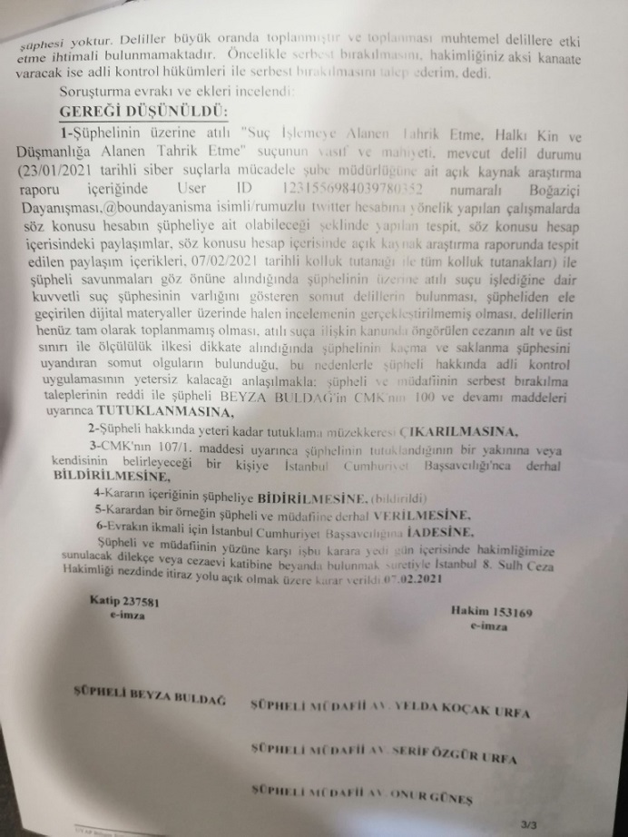 Beyza Buldağ'ın avukatı Şerif Özgür Urfa sosyal medya hesabından süreci ve kararı paylaştı; "Suçlamalar: @boundayanisma hesabını yönettiği iddiasıyla,12. CB'ye mektup sebebiyle CB'na hakaret, diğer paylaşımlar sebebiyle halkı kin,nefret,düşmanlığa tahrik etme ve suç işlemeye tahrik. Tek delil ise telefon numarasının son iki hanesinin 12 ile bitmesi Hesabın kurtarma telefon numarasının son iki hanesi 12 ile bittiği gerekçe gösterilip Beyza'nın da telefon numarasının 12 ile bitiyor olması dışında dosyada hiçbir tespit bulunmuyor. Halkı kin nefret düşmanlığa tahrik ve suç işlemeye tahrik suçlarından dolayı tutuklama istemiyle mahkemeye sevkedildi.