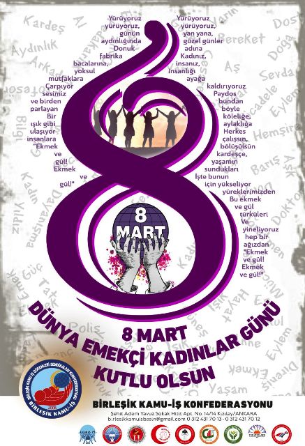 Birleşik Kamu-İş Konfederasyonu'ndan 8 Mart Dünya Kadınlar Günü dolayısıyla yazılı bir açıklama yapıldı.