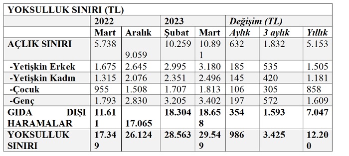 Açlık sınırı martta bir önceki aya göre 632 lira artarken, gıda dışındaki ihtiyaçlar için yapılması gereken harcama 354 lira artarak 18 bin 658 liraya yükseldi. Martta yoksulluk sınırı önceki aya göre da 986 lira arttı. Bir yıl öncesine göre ise açlık sınırı 5 bin 153 lira, gıda dışındaki ihtiyaçlar için yapılması gereken harcama ise 7 bin 47 lira arttı. Yoksulluk sınırı son yılda toplam 12 bin 200 liralık artış gösterdi.