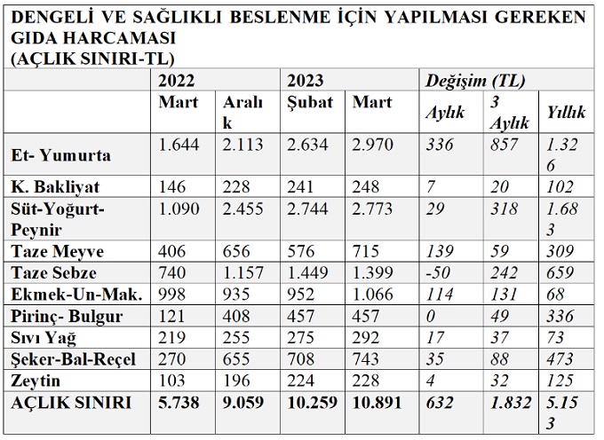 Mart ayında dört kişilik bir ailenin dengeli beslenmesi için yapması gereken aylık gıda harcaması 632 lira artarak 10 bin 891 liraya çıktı.