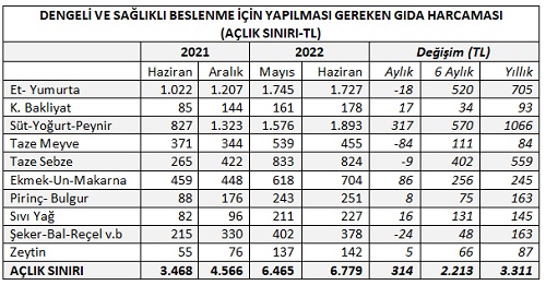 Birleşik Kamu-İş Konfederasyon’unun Ar-Ge birimi KAMU-AR’ın, dört kişilik bir ailenin, dengeli ve sağlıklı beslenebilmesi için tüketmesi gereken gıda miktarlarını esas alarak hesapladığı açlık sınırı Haziran 2022 sonuçları açıklandı