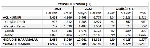 Açlık sınırı haziranda bir önceki aya göre 314 lira artarken, gıda dışındaki ihtiyaçlar için yapılması gereken harcama 420 lira artarak 13 bin 361 liraya yükseldi, yoksulluk sınırı da 736 lira daha artarak 20 bin 140 lira çıktı. Geçen yıl haziran ayına göre ise açlık sınırı 3 bin 311 lira, gıda dışındaki ihtiyaçlar için yapılması gereken harcama ise 4 bin 877 lira arttı. Ailelerin gıda ve gıda dışı ihtiyaçlarını insan onuruna yaraşır bir şekilde yoksunluk hissi çekmeden karşılayabilmesi için yapması gereken toplam harcama tutarını gösteren yoksulluk sınırı son bir yılda toplam 8 bin 215 liralık artış gösterdi.