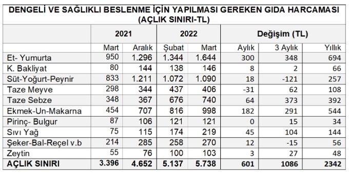 Dört kişilik bir ailenin dengeli ve sağlıklı beslenebilmesi için alması gereken kaloriyi sağlayacak gıda maddelerinden oluşturulan bir sepete bir ay süreyle ödenmesi gereken para mart ayı gıda fiyatlarıyla 5 bin 738 lira olarak hesaplandı.