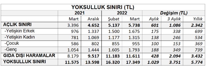 Dört kişilik bir ailenin insan onuruna yaraşır bir şekilde yaşayabilmesi için yapması gereken zorunlu gıda ile gıda dışı harcamaların toplam tutarını gösteren yoksulluk sınırı (içki ve sigara harcamaları hariç) ise martta bin 29 lira artarak 17 bin 349 liraya yükseldi.