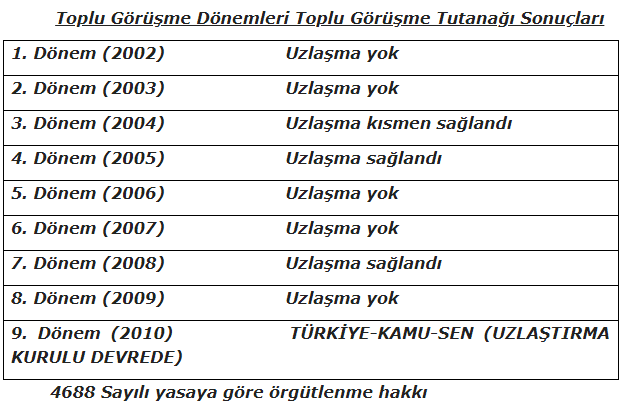 2012 yılında yürürlüğe giren 6289 sayılı Kamu Görevlileri Sendikaları Kanunundan önce toplu iş sözleşmesi sürecinde ortaya çıkan sonuç şu şekildedir: