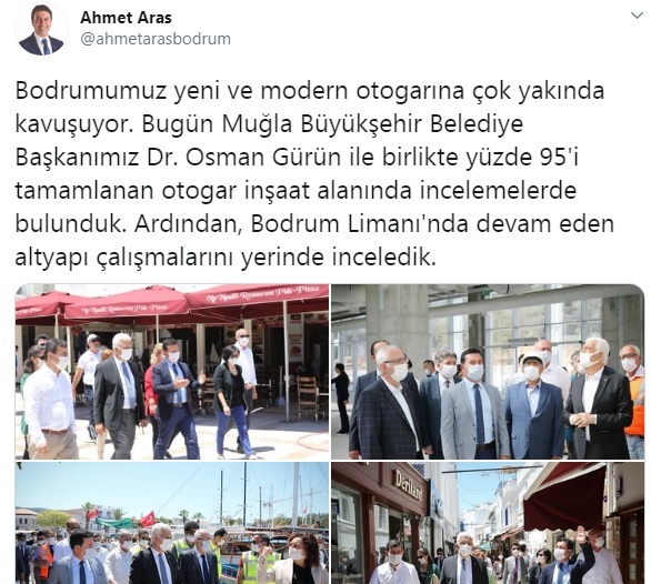 Aras ayrıca Muğla Büyükşehir Belediye Başkanı Dr. Osman Gürün ile birlikte yüzde 95'i tamamlanan otogar inşaat alanında incelemelerde bulunduğunu daha sonrada Bodrum Limanı'nda devam eden altyapı çalışmalarını yerinde incelediğini paylaştı.