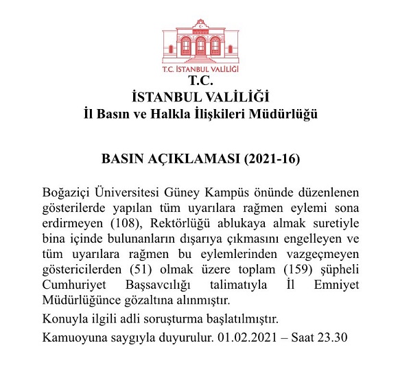 "Boğaziçi Üniversitesi Güney Kampüsü önünde düzenlenen gösterilerde yapılan tüm uyarılara rağmen eylemi sona erdirmeyen (108), Rektörlüğü ablukaya almak suretiyle bina içinde bulunanların dışarıya çıkmasını engelleyen ve tüm uyarılara rağmen bu eylemlerinden vazgeçmeyen göstericilerde (51) olmak üzere toplam (159) şüpheli Cumhuriyet Başsavcılığı talimatıyla İl Emniyet Müdürlüğünce gözaltına alınmıştır. Konuyla ilgili adli soruşturma başlamıştır.