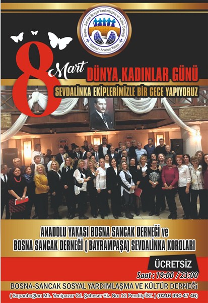 İstanbul Anadolu Yakası Bosna-Sancak Sosyal Yardımlaşma ve Kültür Derneği, 8 Mart Dünya Kadınlar Günü dolayısıyla bir etkinlik düzenleyecek.