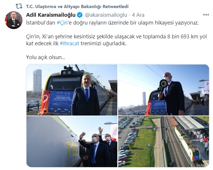 Ulaştırma ve Altyapı Bakanı Adil Karaismailoğlu tarafından duyuruldu; "İstanbul’dan #Çin'e doğru rayların üzerinde bir ulaşım hikayesi yazıyoruz.